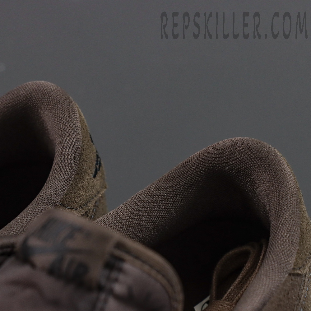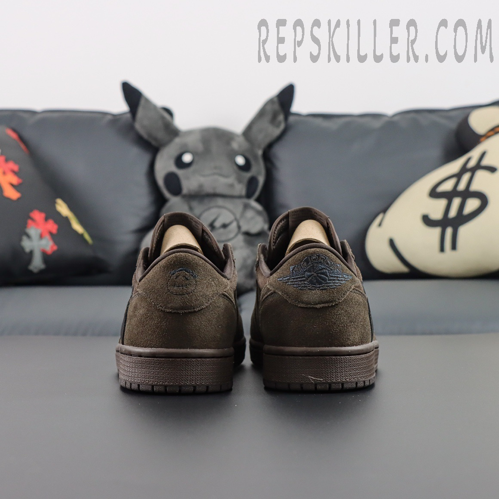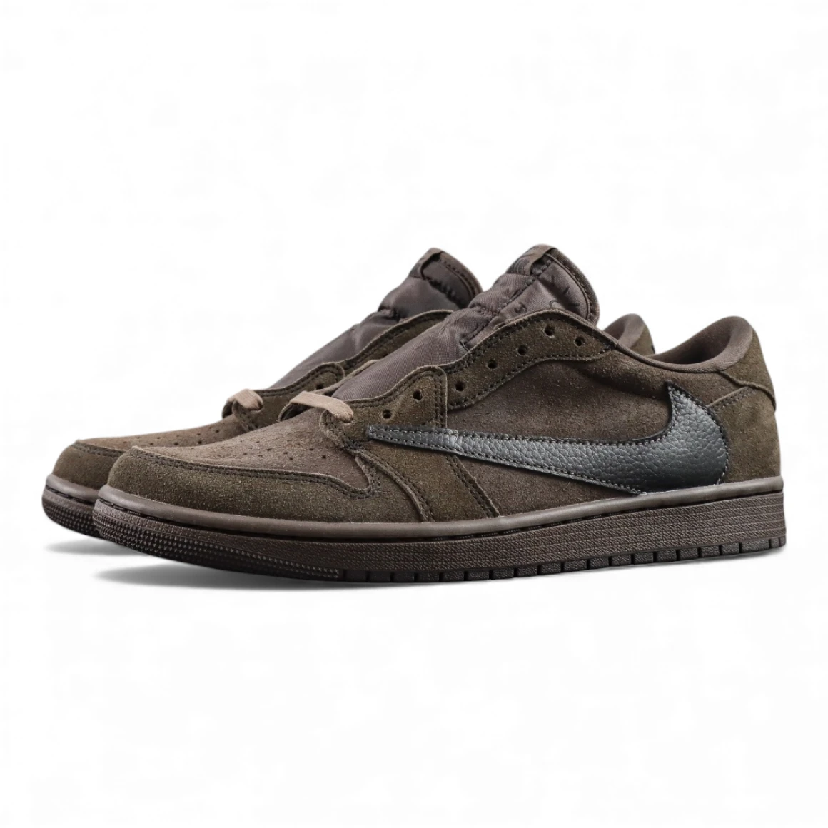 The Travis Scott x Jordan 1 Retro Low OG SP ‘Velvet Brown’ arrives with a premium mix of brown suede and black tumbled leather, delivering a vintage yet luxurious aesthetic. Scott’s signature reverse Swoosh appears on the lateral side, adding unmistakable Cactus Jack DNA. A woven Nike Air tongue tag reinforces the classic OG identity, while mismatched Cactus Jack and Jordan Wings embroidery decorates each heel tab.