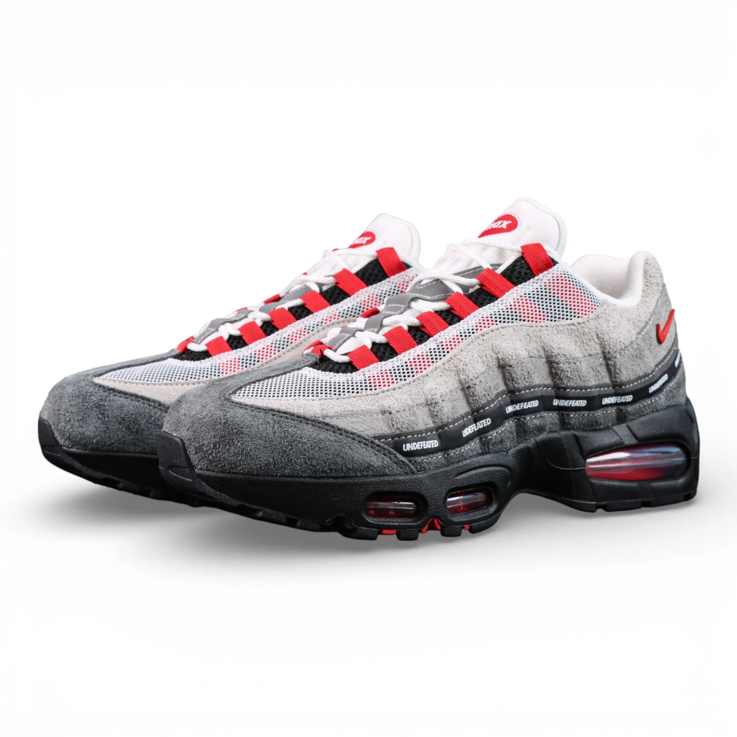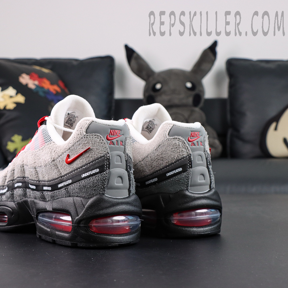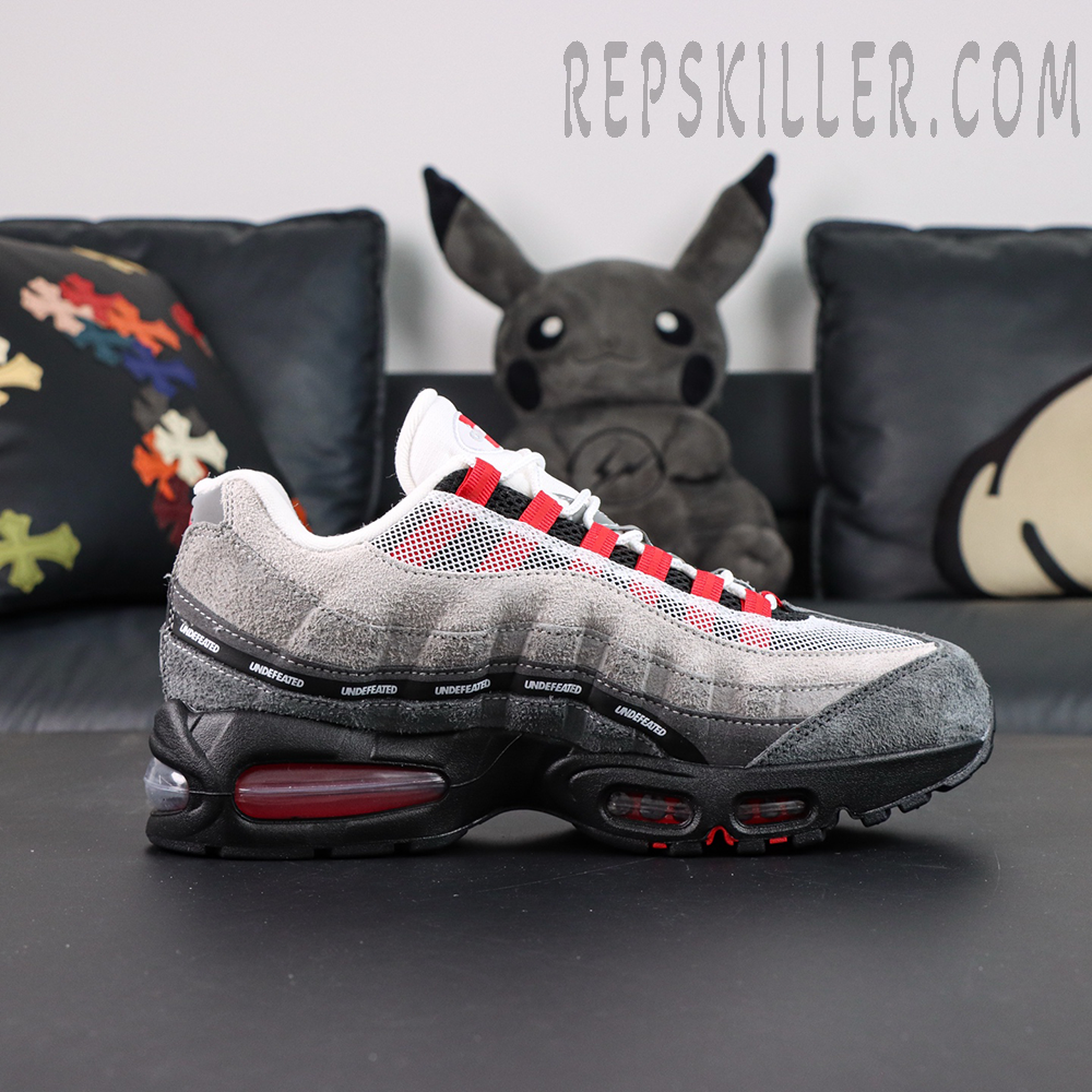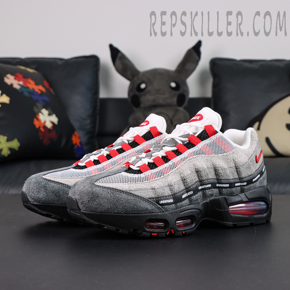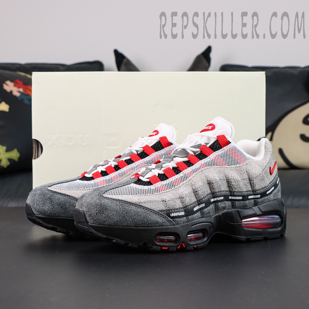 Built on the classic Air Max 95 anatomy, the sneaker features layered suede and breathable mesh uppers in gradient grey tones, creating depth and texture across the wavy side panels. Striking Bright Crimson accents energize the look, appearing on the lace loops, heel branding, and visible Air units for a sharp pop of color. A signature UNDEFEATED repeating logo strip runs across the midfoot, reinforcing the exclusivity and collaboration identity—key details sought after in high-quality Nike reps.