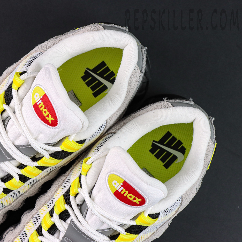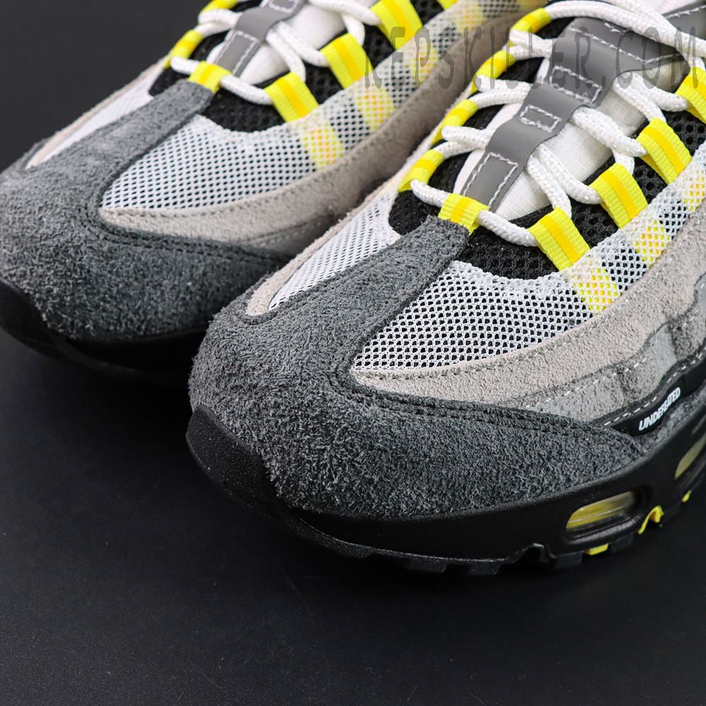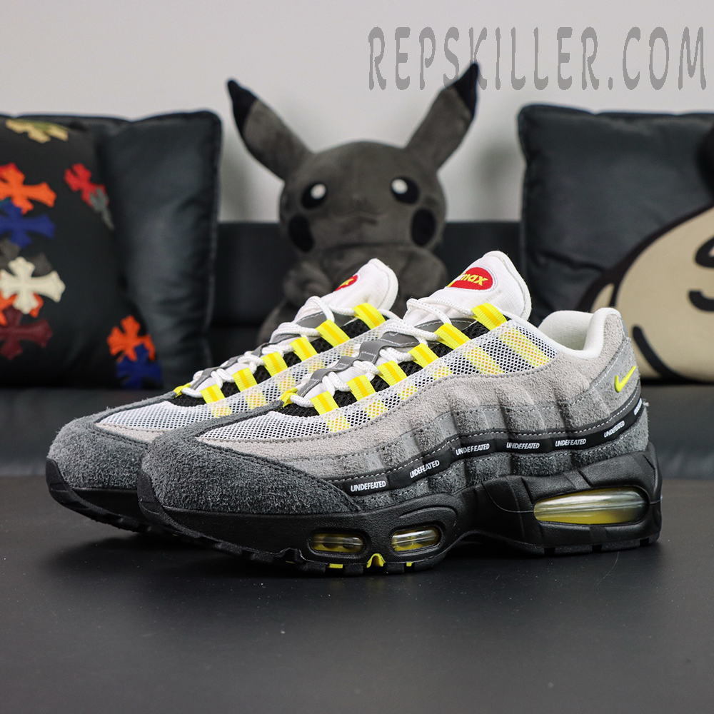 The upper features layered grey mesh and suede panels, staying true to the Air Max 95’s signature anatomical design lines. Bright yellow accents pop through the lace loops, tongue branding, heel Swoosh, and visible Air units, injecting energy and contrast into the neutral base. A black midfoot strip wrapped in repeating UNDEFEATED text adds instant recognition and reinforces the collaboration’s streetwear credibility—key details sought after in high-quality Nike Air Max reps.