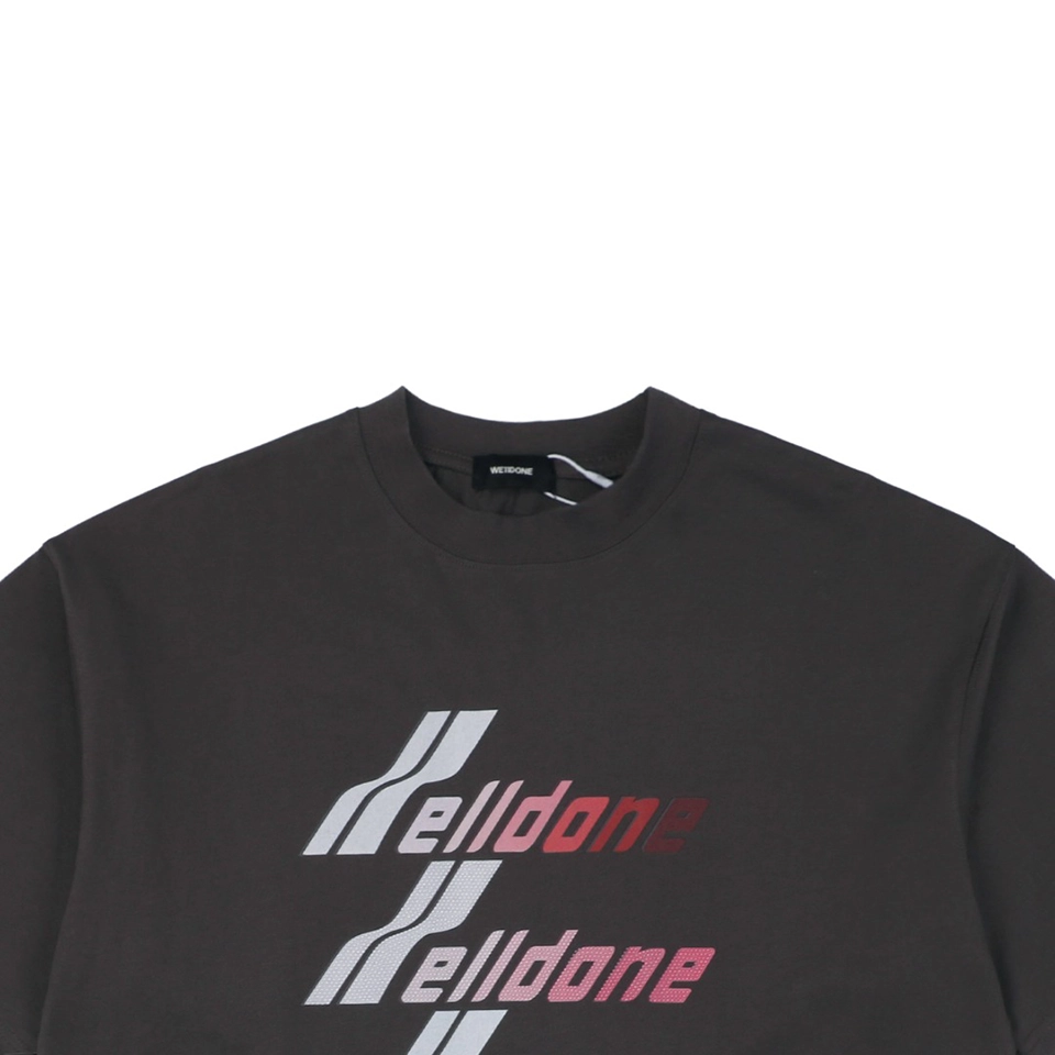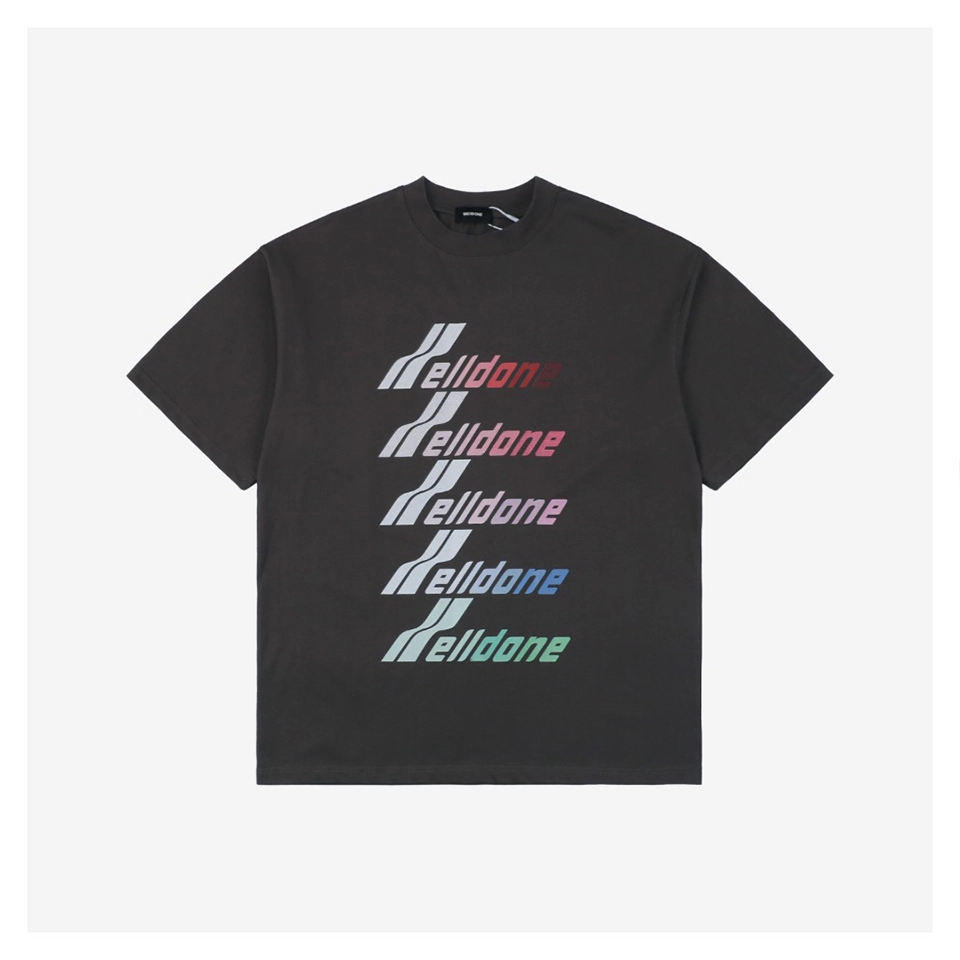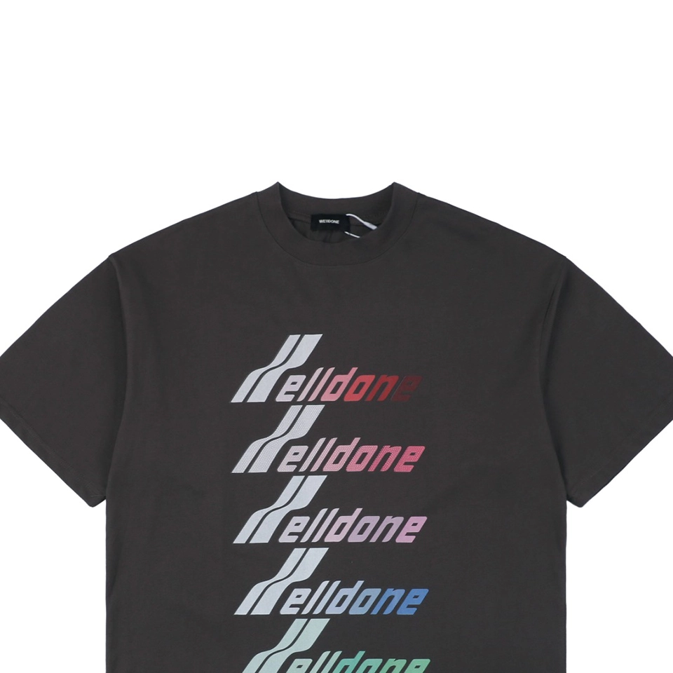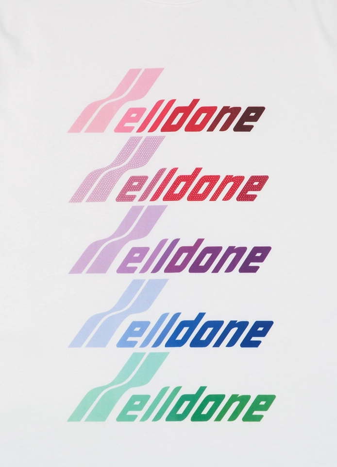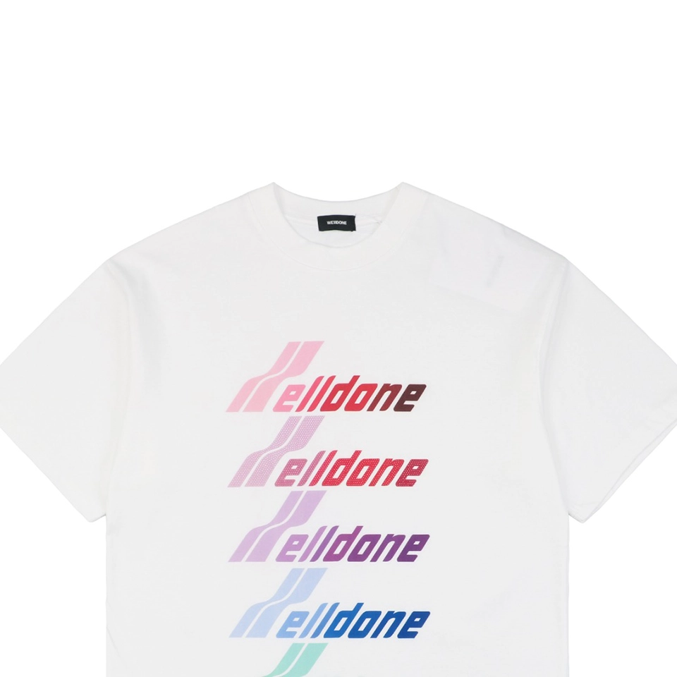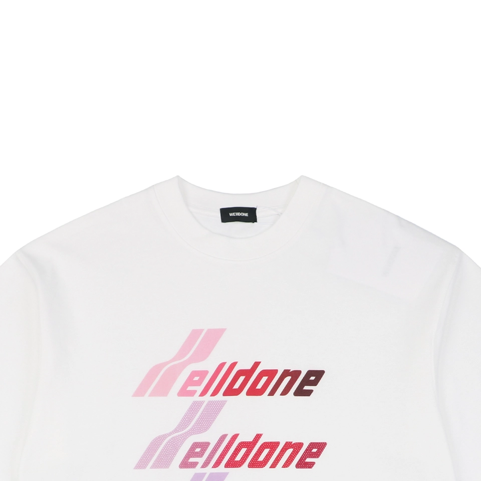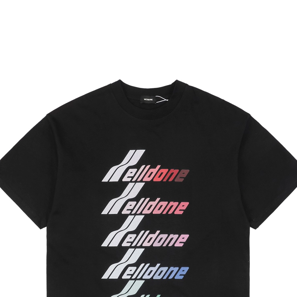 The We11done Multicolor Gradient Logo T-shirt brings a lively twist to minimalist streetwear. Crafted from soft cotton in a classic white/black/dark grey tone, the front features a stacked arrangement of the We11done logo in a spectrum of colorful rhinestone-like gradients. The simple rear keeps the attention on the vibrant front print, while the oversized fit adds comfort and attitude.