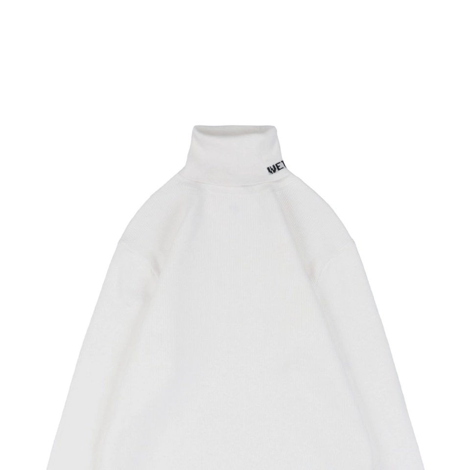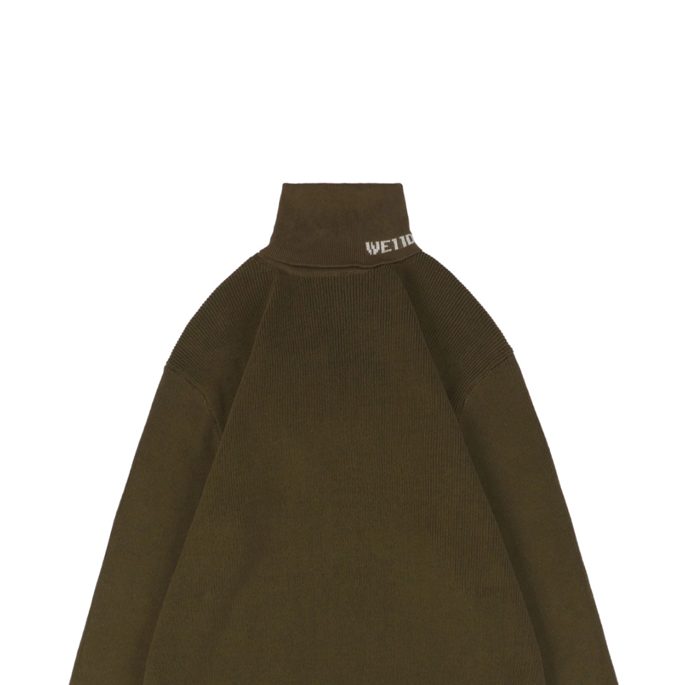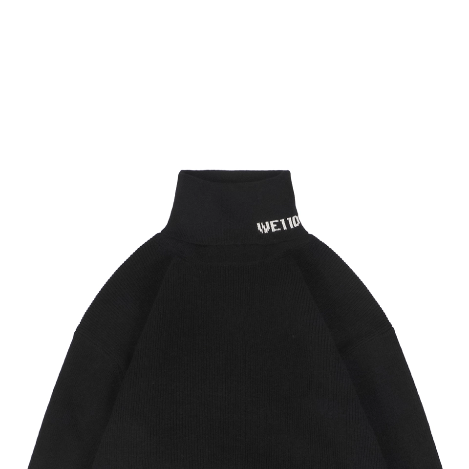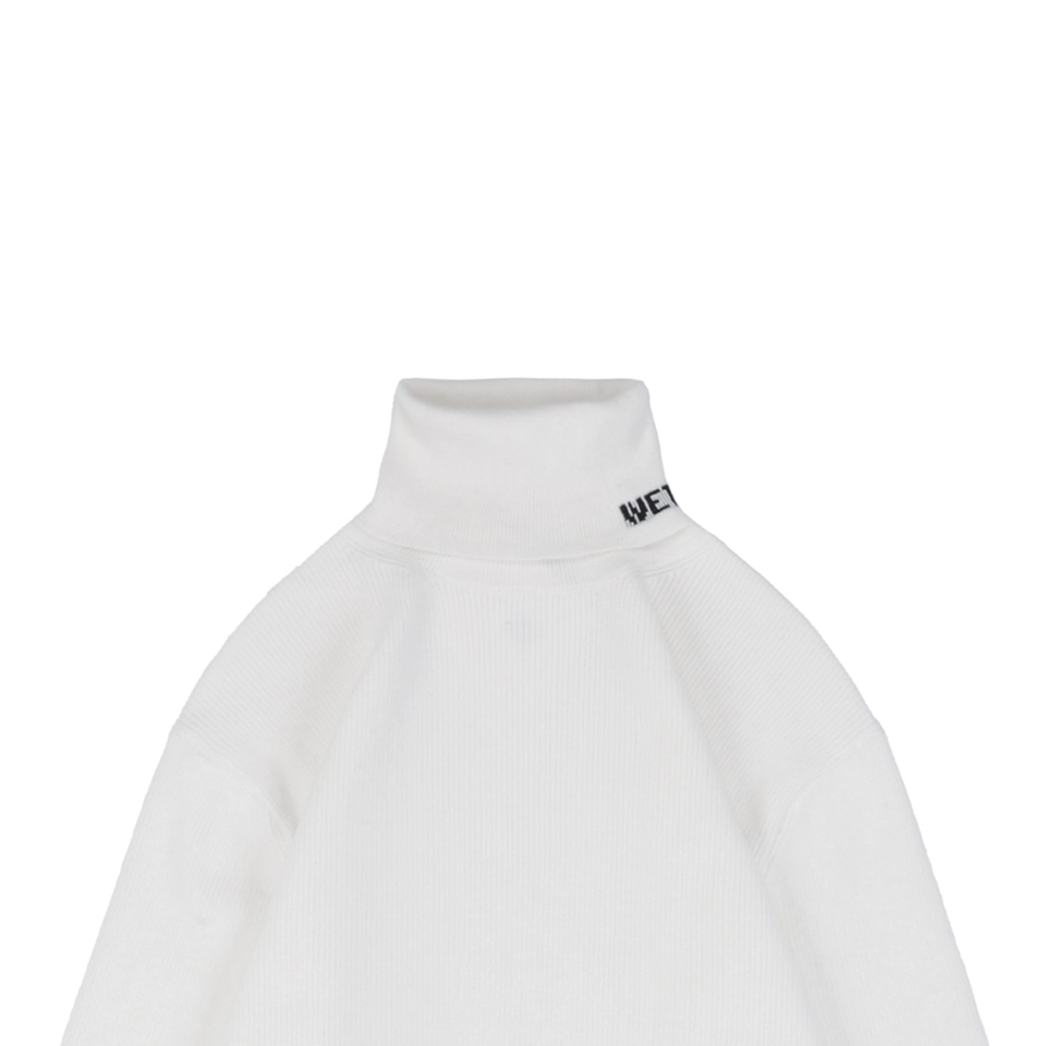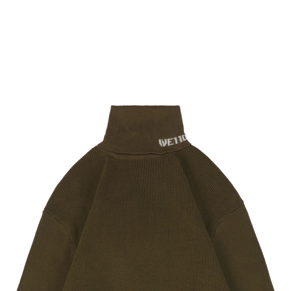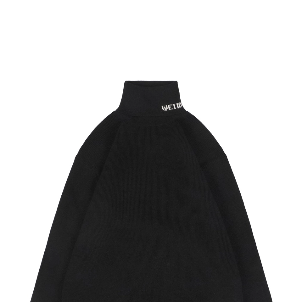 The folded turtleneck is subtly detailed with a small “WE / WE11DONE” embroidered logo, adding understated identity.
