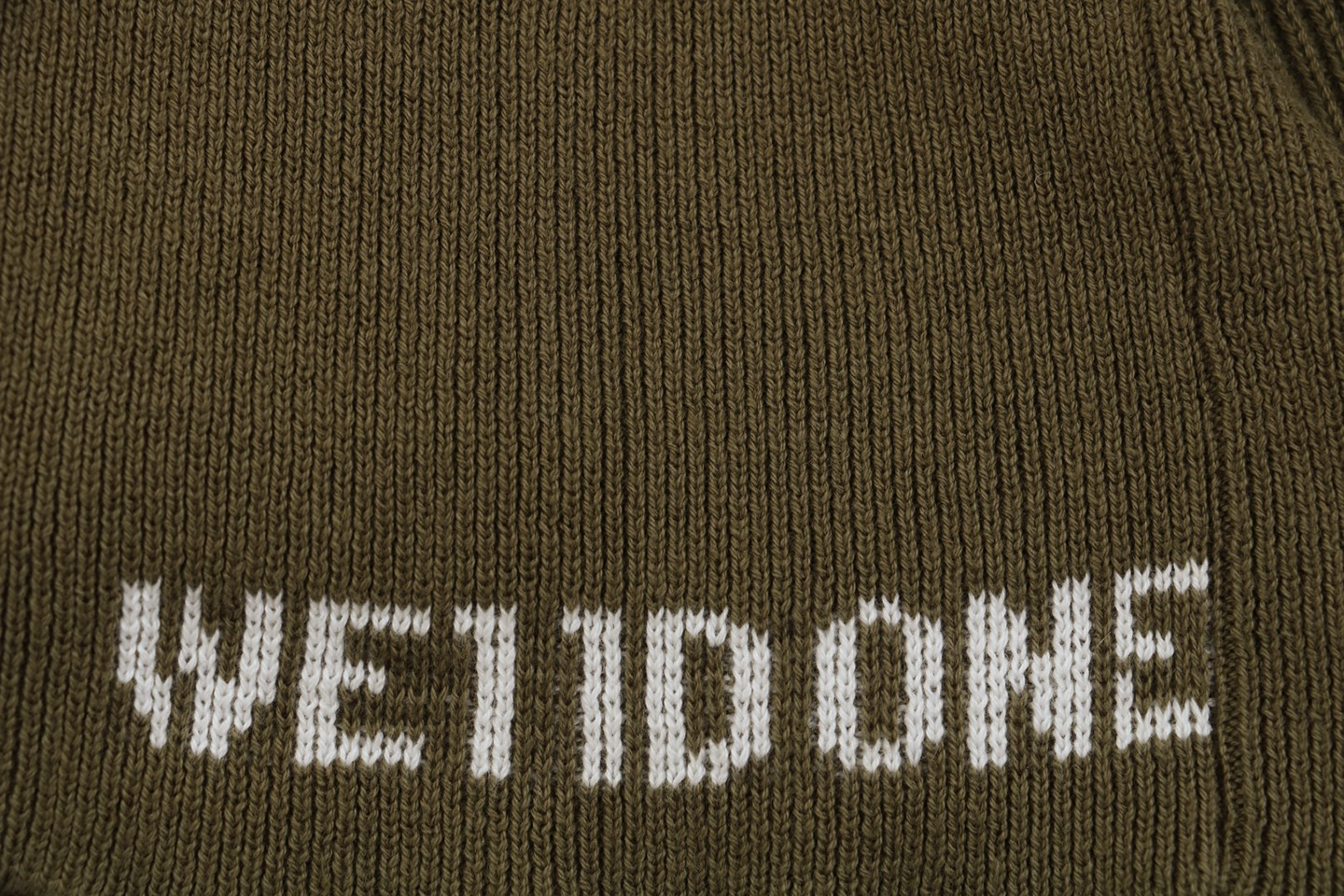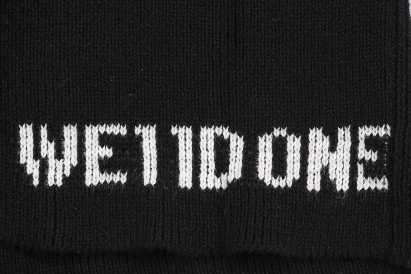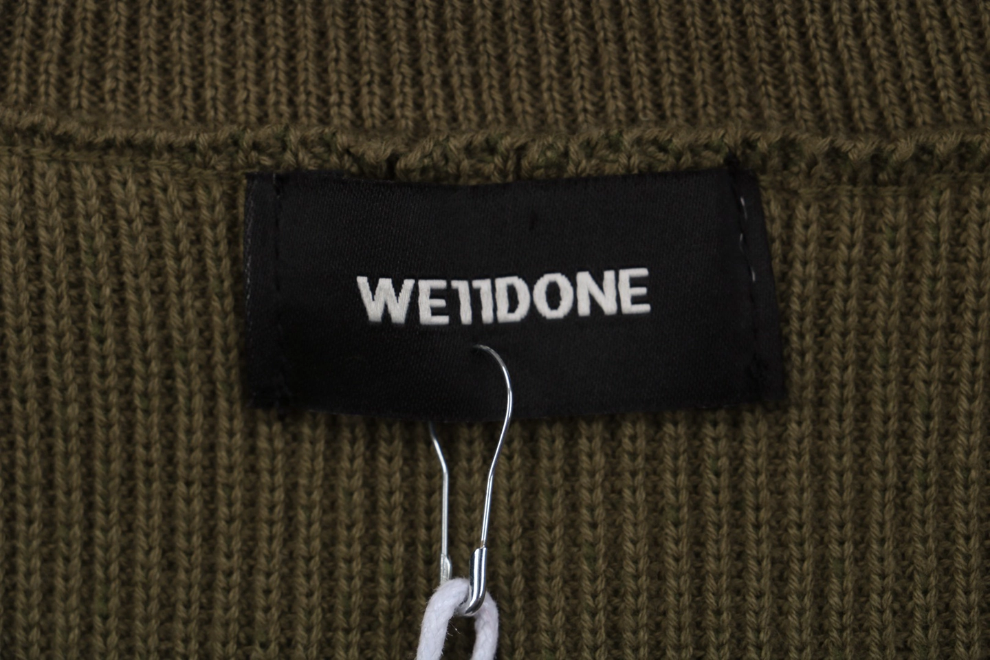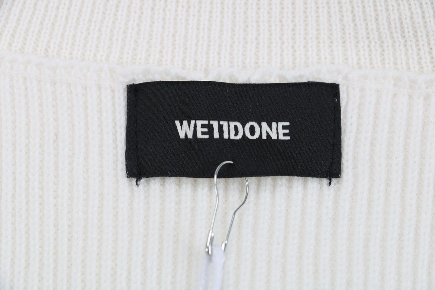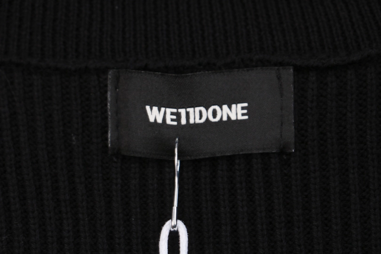 The folded turtleneck is subtly detailed with a small “WE / WE11DONE” embroidered logo, adding understated identity.