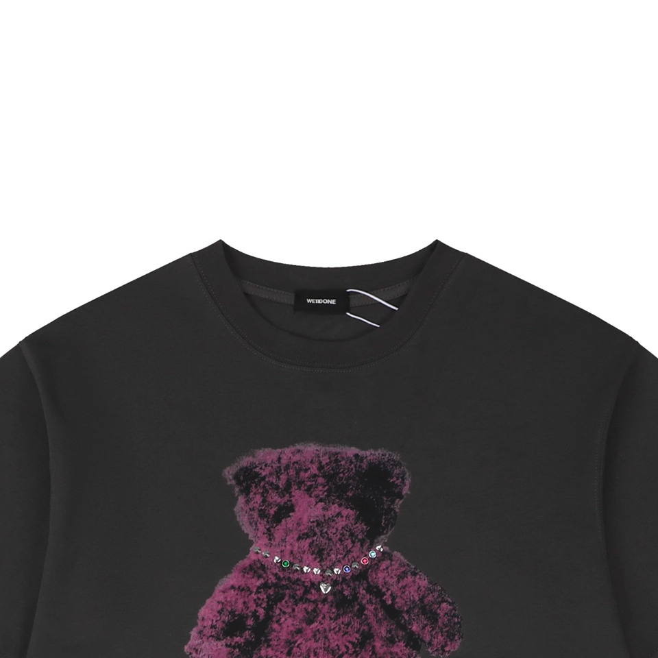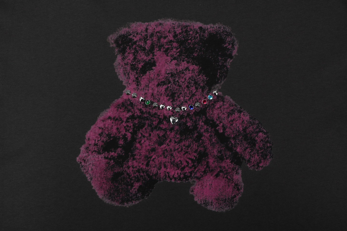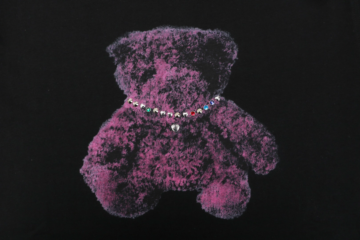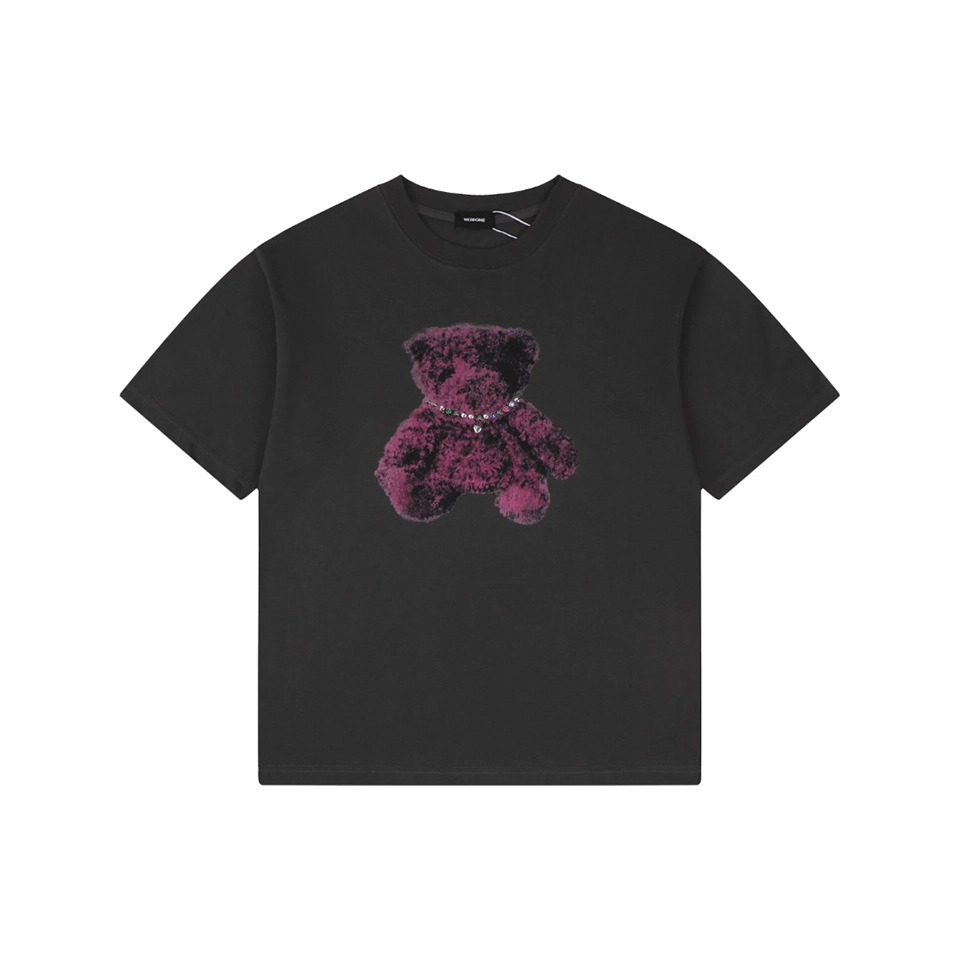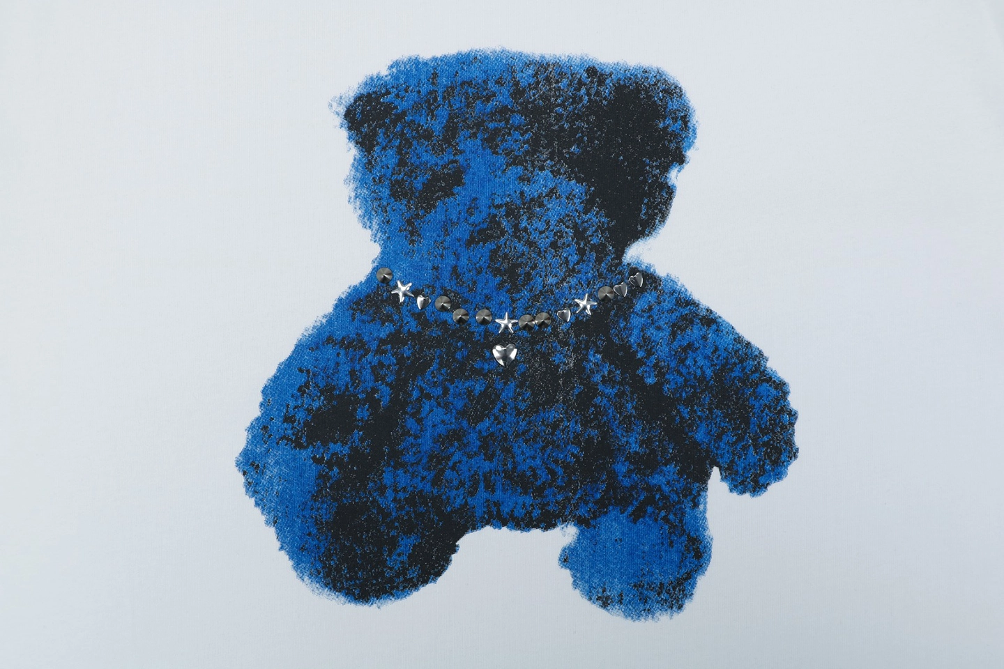 The centerpiece of the design is the teddy bear graphic wearing a rhinestone-style necklace, adding a subtle statement that merges street culture with artistic expression. The contrast between the minimalist base and the expressive graphic creates a balanced, contemporary style full of youthful energy.