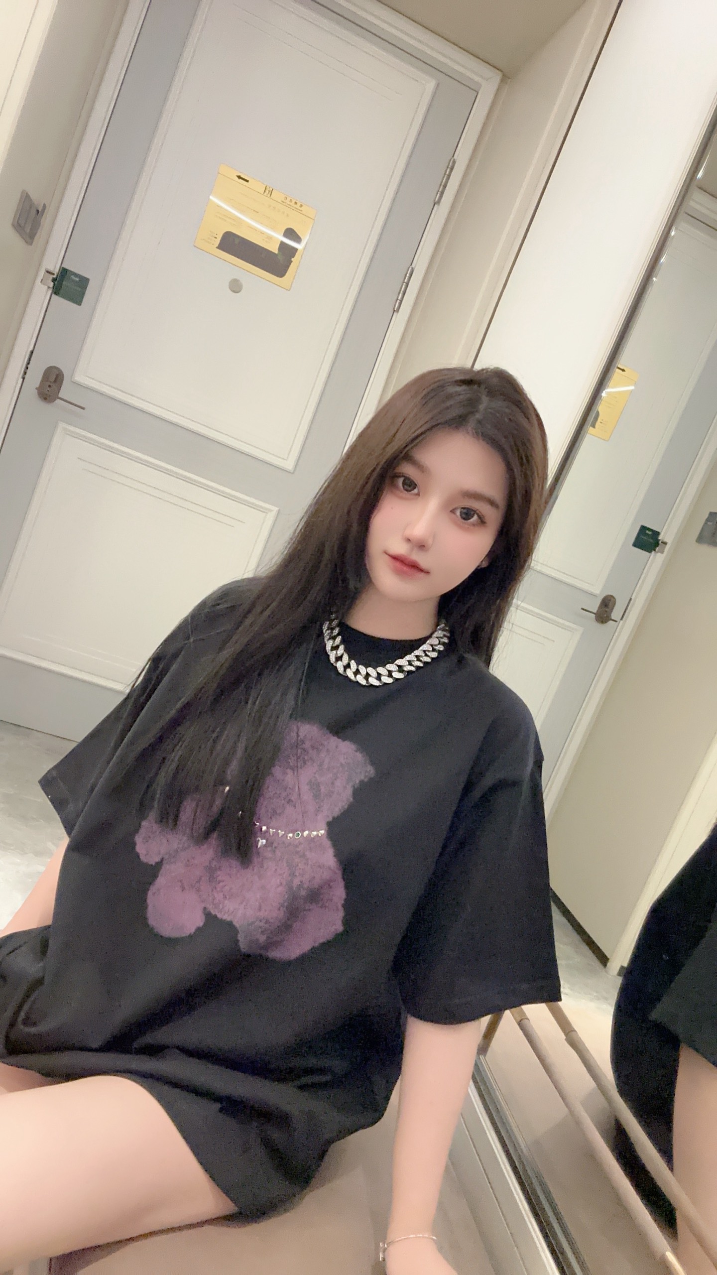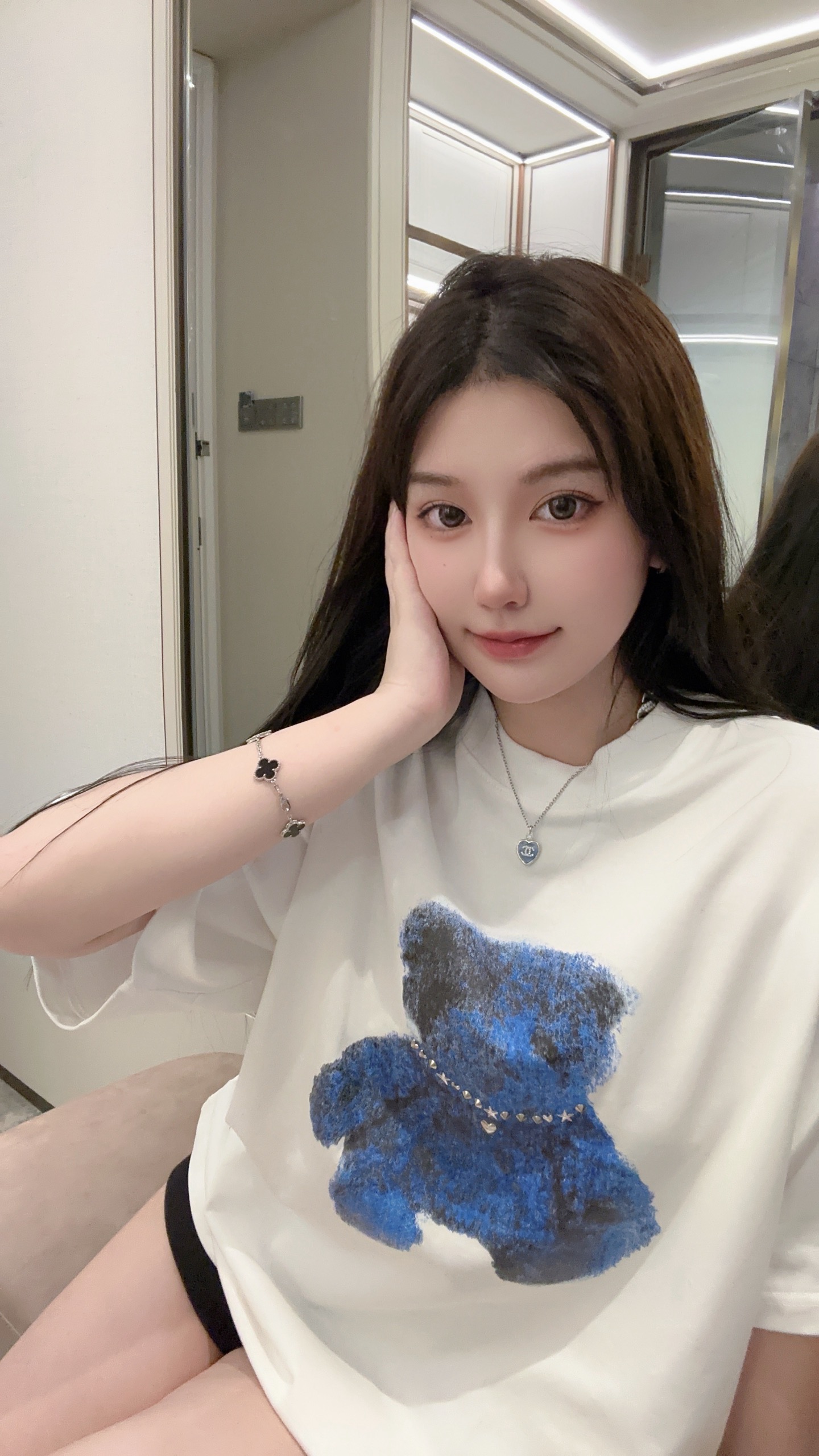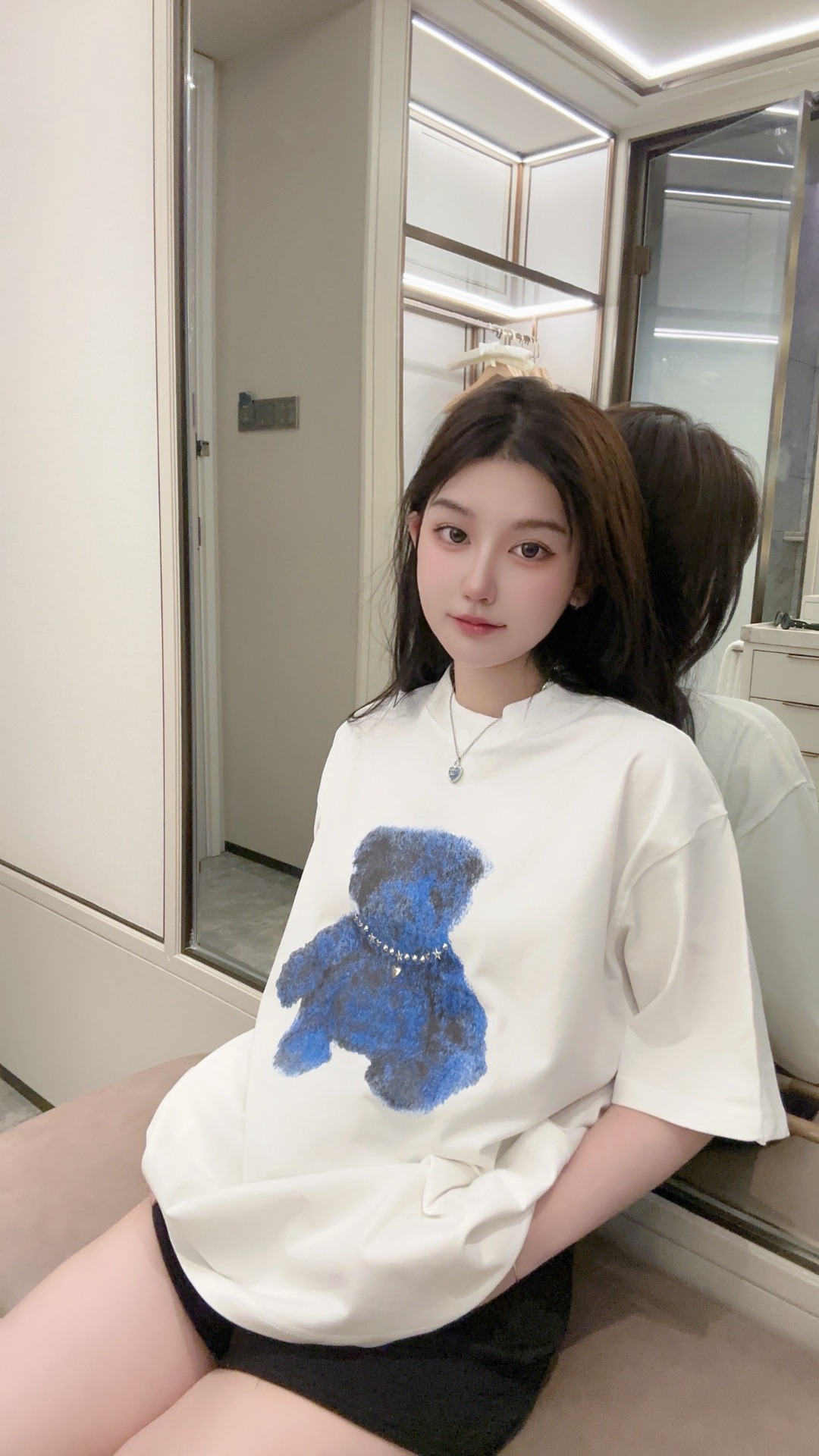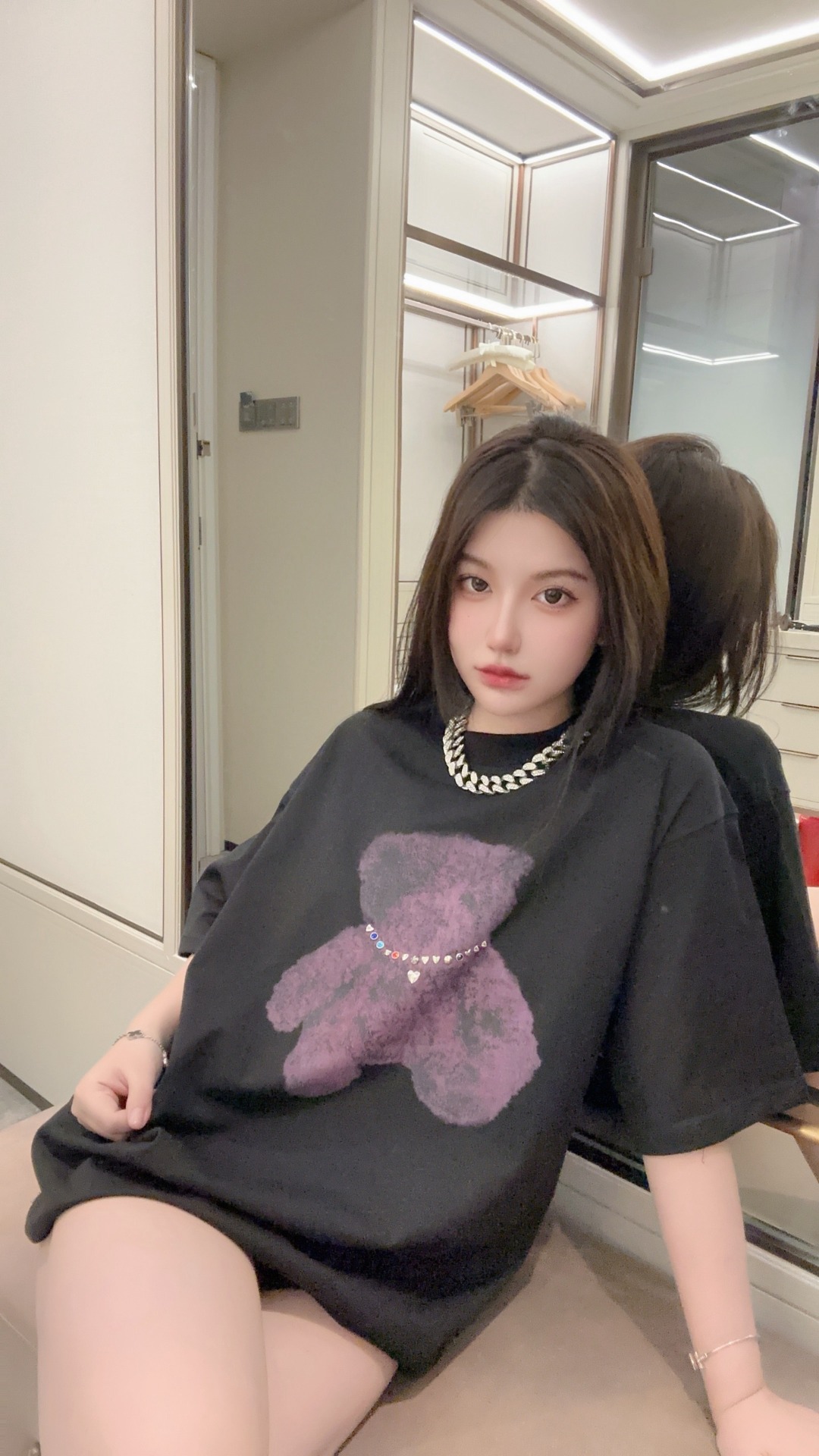 The centerpiece of the design is the teddy bear graphic wearing a rhinestone-style necklace, adding a subtle statement that merges street culture with artistic expression. The contrast between the minimalist base and the expressive graphic creates a balanced, contemporary style full of youthful energy.