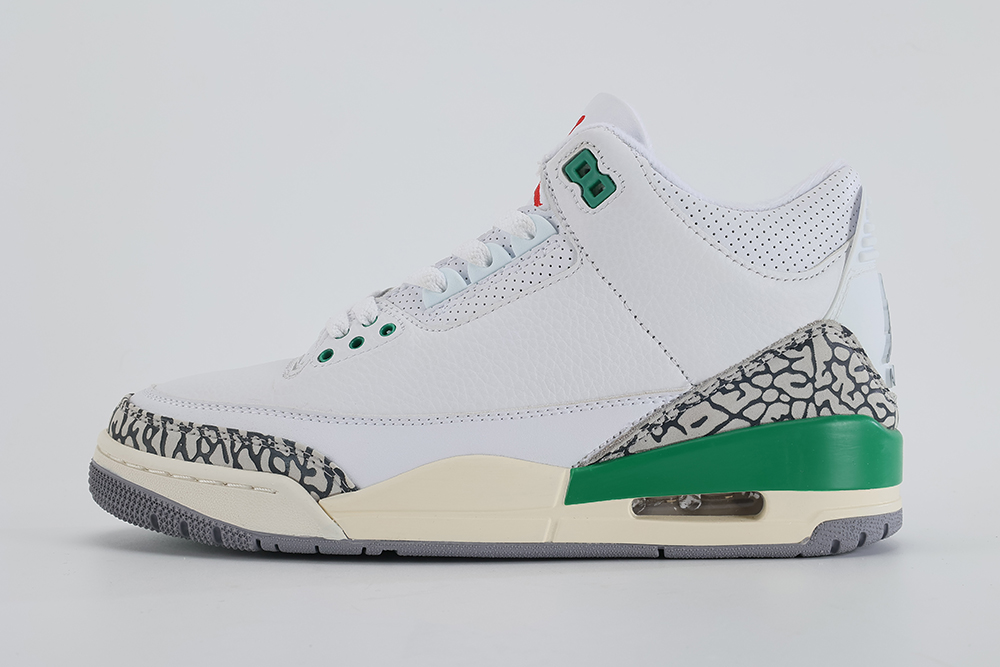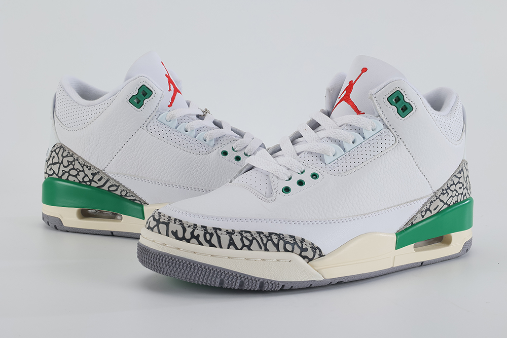 The Air Jordan 3 Retro ‘Lucky Green’ is a refreshing and vibrant take on the iconic Air Jordan 3 silhouette, infusing it with a new lease of life and a burst of energy. As suggested by its name, the ‘Lucky Green’ colorway features a striking green leather upper that commands attention, setting it apart from more traditional color schemes. This bold hue is balanced with accents of white and grey, found on the midsole, elephant print overlays, and the Jumpman logo on the tongue, creating a harmonious and eye-catching aesthetic.