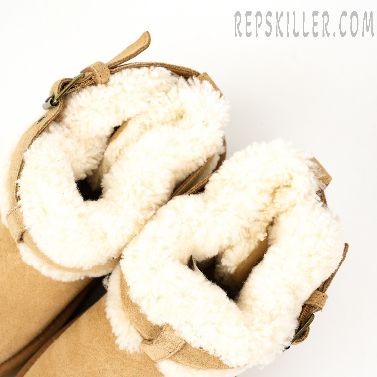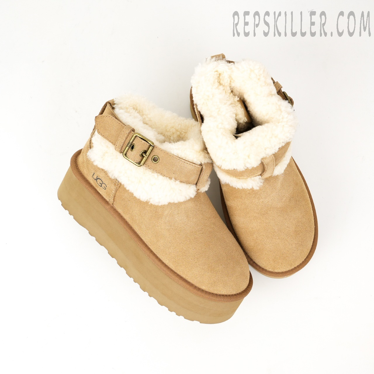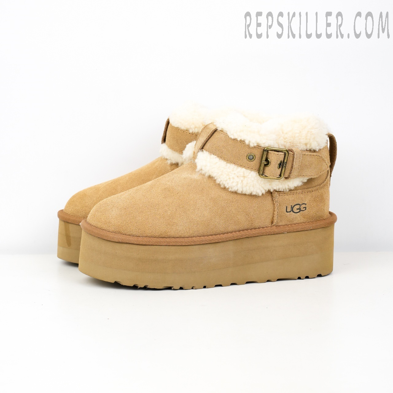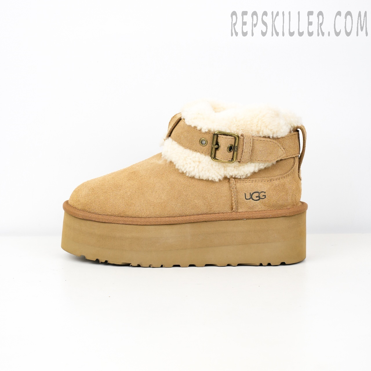 The UGG Wmns Ultra Mini Belted Roller Boots add an edgy twist to the classic Ultra Mini. A wide strap with a functional metal buckle crosses the soft curly upper for a bold, punk-inspired touch. The 2” lightweight platform enhances height and style, while the cozy UGGplush™ upcycled wool blend lining keeps you warm. Finished with a SugarSole™ outsole made from renewable sugarcane, this boot balances softness and attitude. Pair it with distressed jeans or shorts for a leg-lengthening, fashion-forward look.