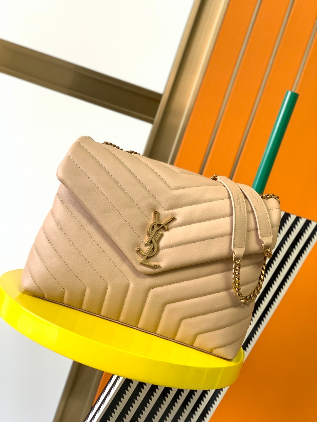 Yves Saint Laurent Medium LouLou In Quilted Leather Beige With Gold Chain 31cm