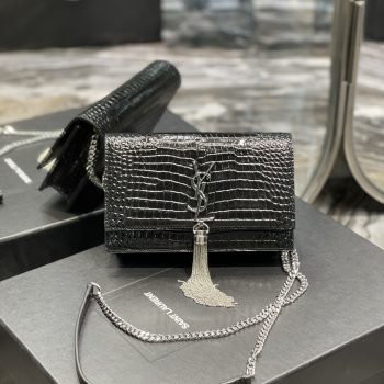 Original Copy Saint Laurent Kate Chain Wallet with Tassel in Crocodile-Embossed Shiny Leather Sliver Hardware